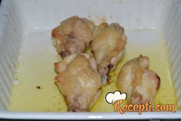 Tako pripremljene batake staviti u rernu. Rernu uključiti na 180 stepeni i peći cca 25 minuta. Dok se piletina peče pripremiti ostale sastojke. Pirinač oprati i procediti.