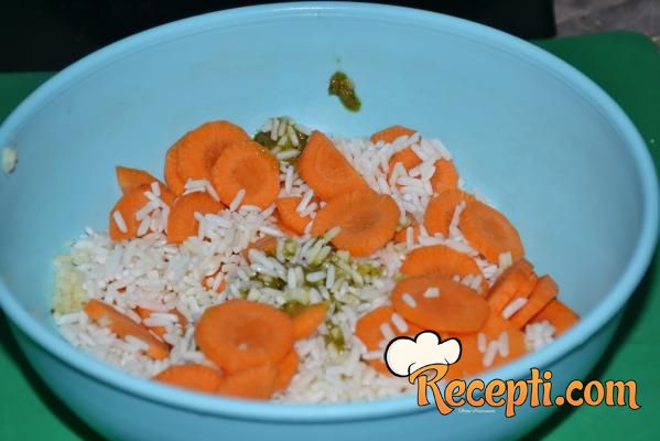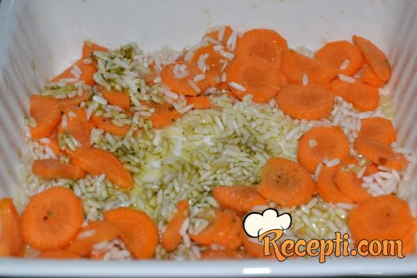 U jednu posudu staviti pirinač, šargarepu i beli luk.
