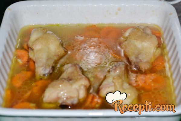 Batake izvaditi, u vatrostalnu posudu rasporediti mešavinu pirinča, šargarepe i belog luka, preliti sa supom i na vrh složiti polupečene pileće batake.