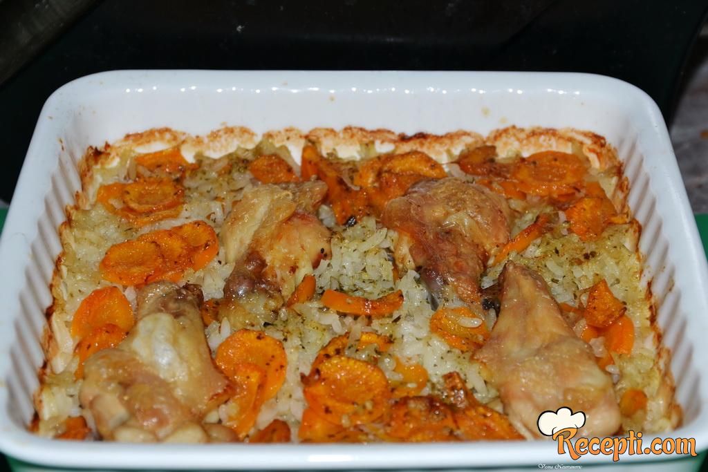Tako pripremljenu piletinu u vtrostalnoj posudi vratiti u rernu i peći cca 30 minuta dok ne ispari sva tečnost i dok pirinač i šargarepa ne omekšaju.