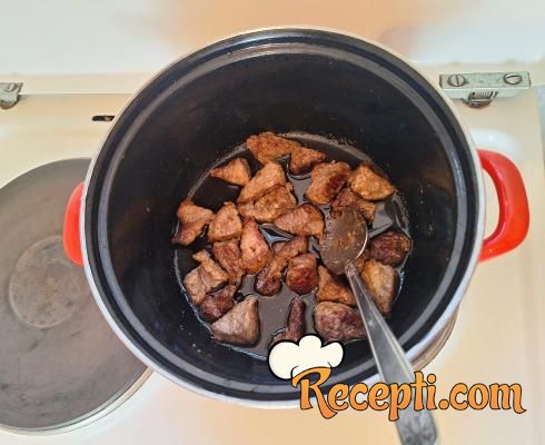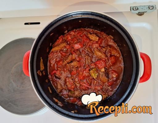 Vratiti meso u paradajz, po potrebi doliti vodu. Sve lepo izmešati i ostaviti da se krčka.