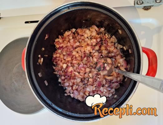 Na istom ulju izdinstati sitno iseckan crni luk. Dodati svež seckani paradajz na kockice ili paradajz pelat. Začiniti biberom, origanom, bosiljkom, posoliti, dodati cimet, loberov list i ostaviti da provri.