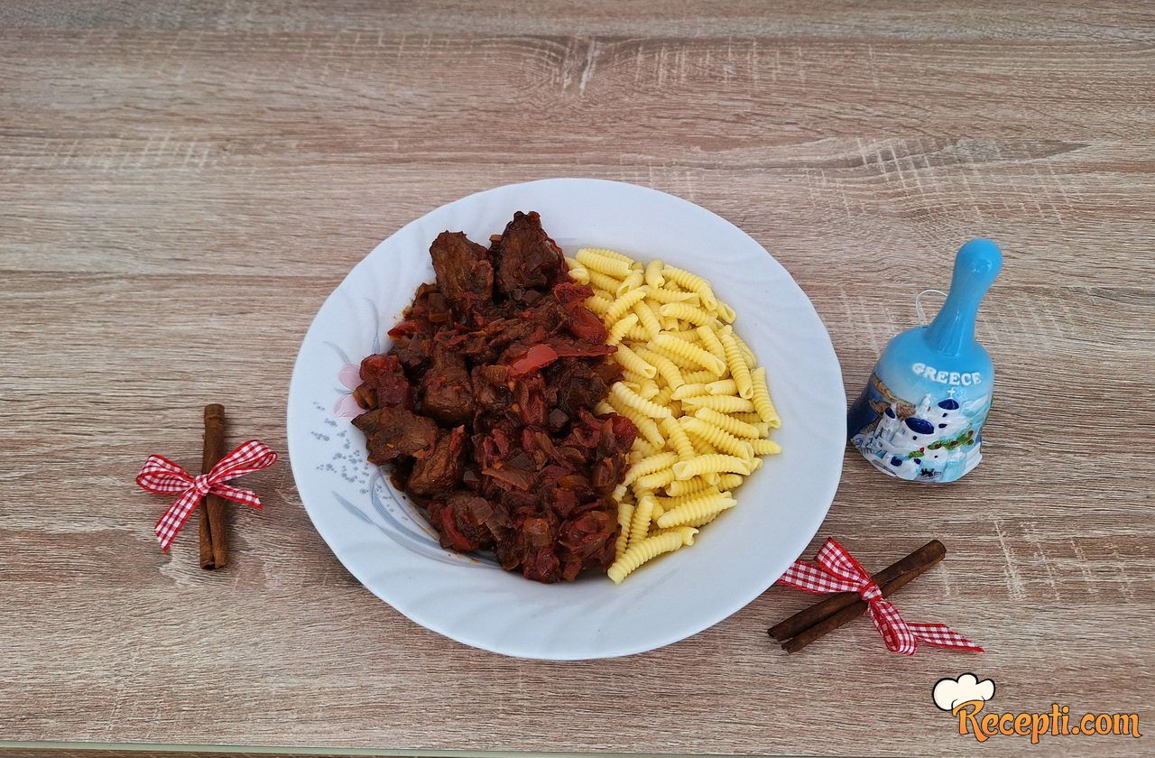 Gulaš kuvadi dok se sos lepo ne zgusne. Gulaš po želji služiti sa krompirom, pirinčem ili testeninom. Najviše volim da pravim gulaš sa svežim paradajzom, ali možete koristiti i paradajz pelat.