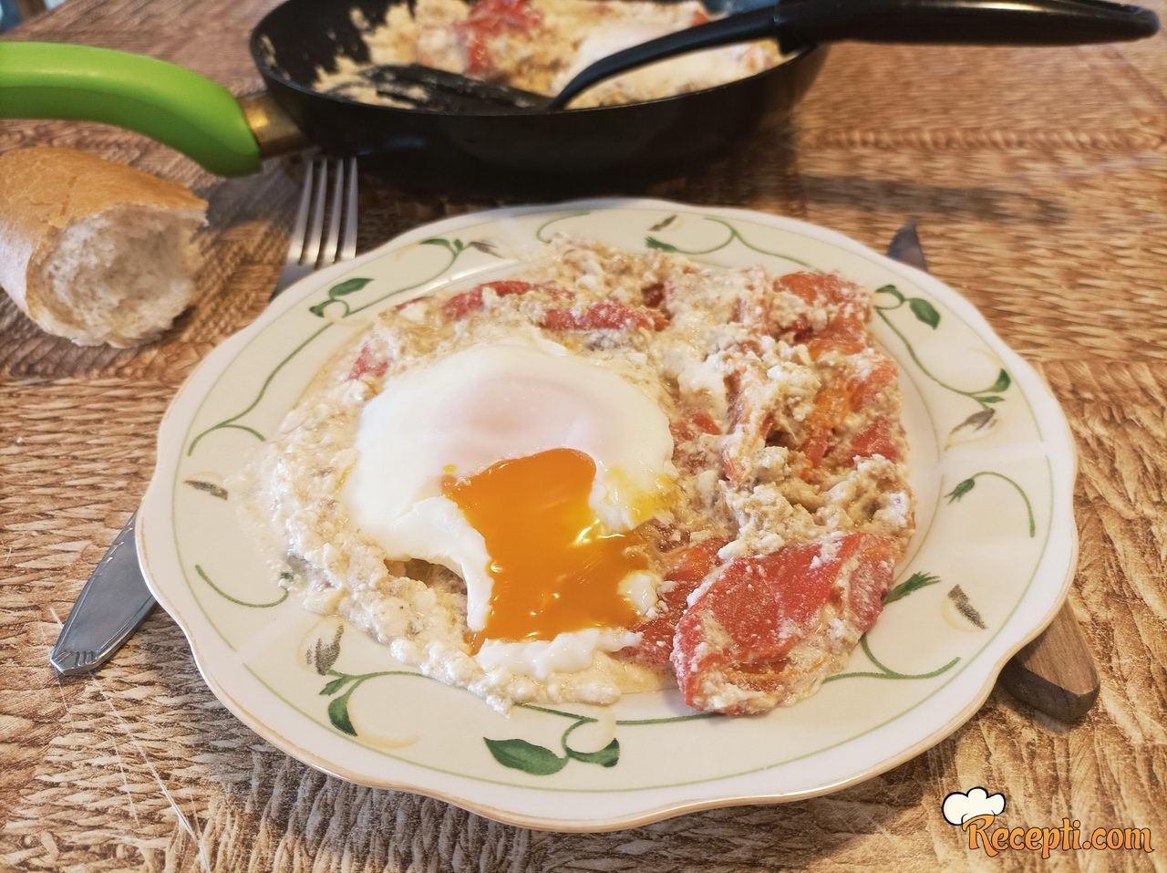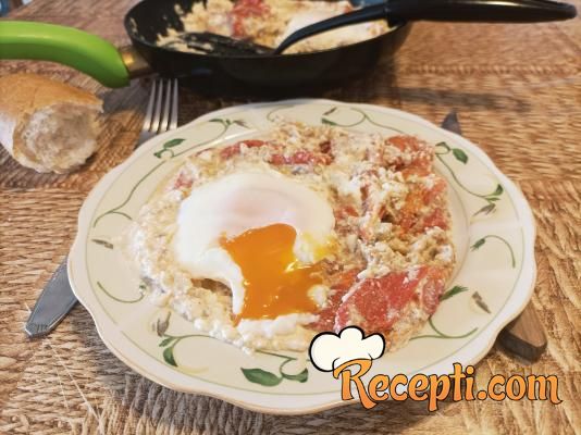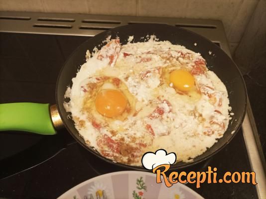 ...promešati i pažljivo razbiti dva jajeta na površinu. Poklopiti i pržiti dok se jaja ne stegnu koliko vi želite. Ja nisam koristila ni so ni biber, vi uradite po svom ukusu.