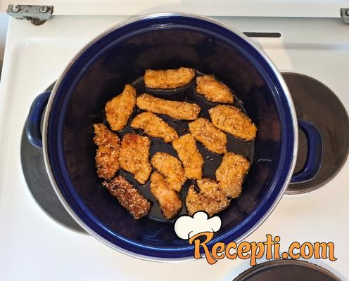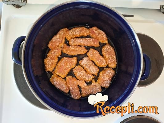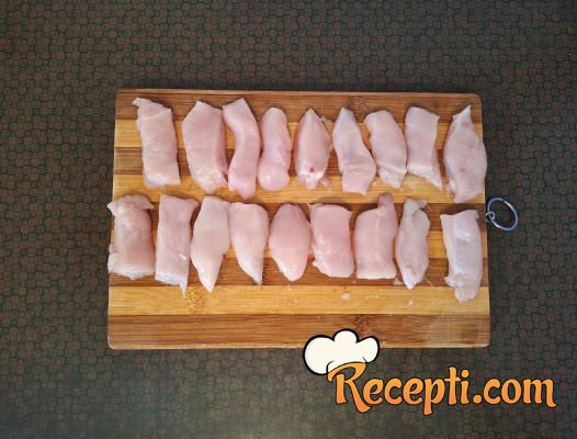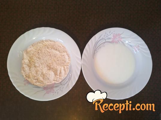Komade piletine prvo umočiti u mleko pa uvaljati u brašno sa začinima. U dubljem sudu otopiti maslac i dodati ulje.