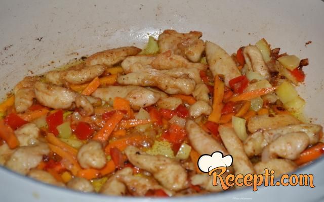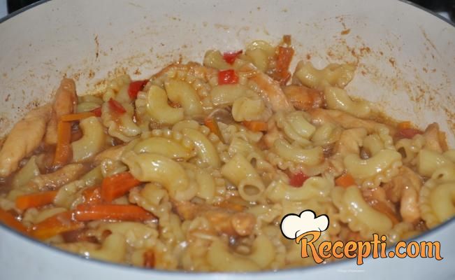 Danas sam odlučila da za ručak napravim piletinu sa testeninom po idejnom receptu "Pileći čau mein rezanci" – visokoproteinski obrok. Kako retko pripremam jela sa testeninom kod kuće nemam mnogo testenine i uvek prvo, pre nego odlučim da kupim neku testeninu potrošim testeninu koju imam kod kuće. Ovo je stvarno veoma ukusan ručak. I primenila sam neke nova saznanja dobijena gledajući kulinarske šoove sa profesionalnim kuvarima,, korušćenje škrobne vode od kuvanja rezanaca za podlevanje.