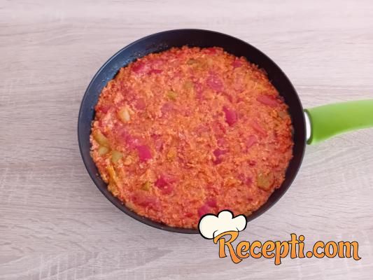 Paradajz zaseći unakrst, staviti u šerpu, preliti vrelom vodom i ostaviti da odatoji 5 minuta. Za to vreme oprati crvenu i zelenu papriku, kao i baburu i naseckati ih. Paradajz preručiti u drugu posudu, preliti hladnom vodom i ostaviti da odstoji par minuta te oljuštiti. Paradajz iseckati. Ulje usuti u tiganj/šerpu, zagrejati, dodati seckan crni luk, seckani beli deo praziluka te propržiti. Dodati seckane paprike i ukrčkati koliko da omekšaju. Zatim dodati šećer, suvi biljni začin, zatim biber, slatku začinsku papriku i izmešati. Dodati seckan paradajz,p osoliti po ukusu, izmešati, poklopiti i ukrčkati dvadesetak minuta. Jaja razmutiti viljuškom, postepeno dodavati u uprženo povrće, sve vreme mešati i ukrčkati 5 minuta. Skloniti sa ringle i poslužiti.