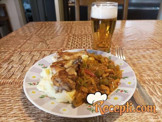 U dubljoj posudi sipati ulje i kada se zagreje ubaciti batačiće posute začinom za piletinu. Ispržiti batačiće, pa ih izvadi u tanjir. U istu masnoću ubaciti crni luk isečen na tanje polurežnjeve, posuti ga sa kašičicom smeđeg šećera i pržiti dok se luk ne karamelizuje. Zatim ubaciti tikvicu i paprike isečene na štapiće i šampinjone isečene na polovine ili četvrtine, ako su krupniji. Posuti sa biljnim začinom, mlevenim biberom i belim lukom, pa dobro sve promešati. Pržiti na srednjoj temperaturi, dok povrće ne omekša (ali da ipak ostane po malo hrskavo).