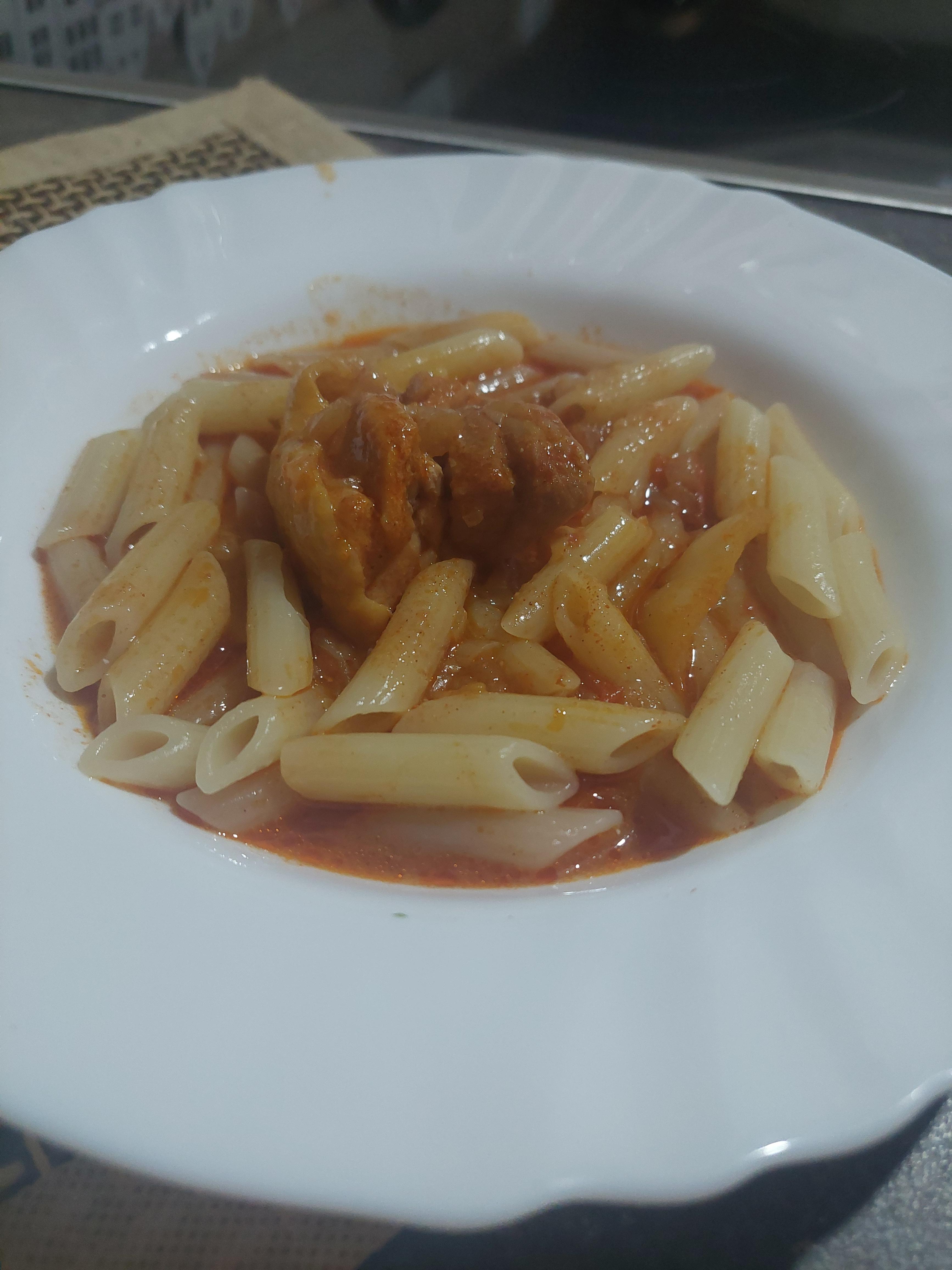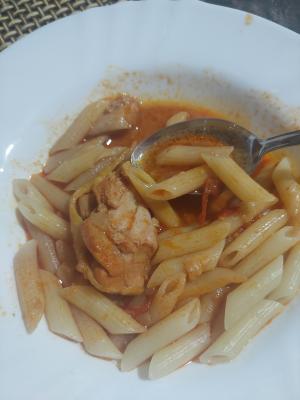 Luk sitno seckati. Propržiti staklasto na masti. Dodati pileće meso iseckano. Pržiti još koji minut. Dodati papriku sečenu i paradajz naseckan, posuti crvenom paprikom. Naliti vodom i posoliti. Nastaviti kuvati.