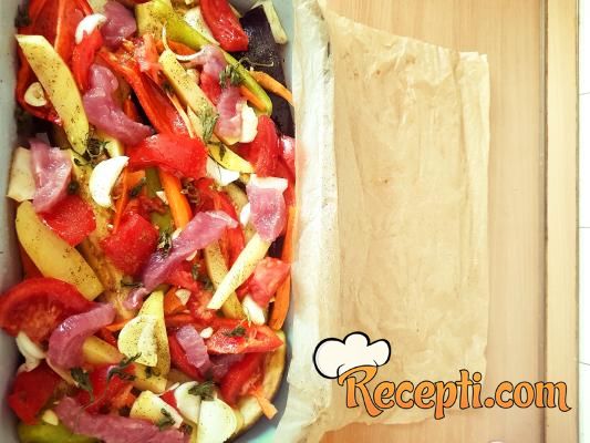Svo povrće operite, očistite, isecite na krupnije komade i stavite u odgovarajući sud za pečenje. Dodajte meso isečeno na manje komade, pa i njega stavite u sud preko povrća. Sve posolite, pobiberite i začinite suvim začinom pa izmešajte. Prelijte uljem, pokrijte papirom za pečenje koji ste pokvasili vodom i stavite u rernu da se peče na 200 stepeni, oko 15 minuta, a zatim sklonite papir i pecite još 15 minuta. Jelo poslužite toplo.