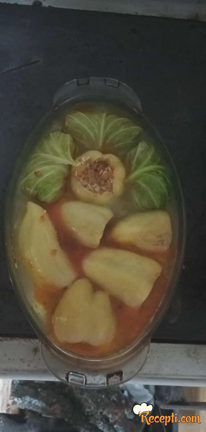 Kuvanje, Kada sve složite, prekrijte ostatkom kupusa. Nalijte vodom da ogrezne (može i malo tečnosti od kupusa).