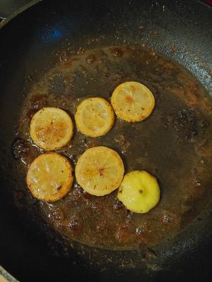 Jedan limun seći na kolutove. Popržiti sa obe stane u istom tignju gde se pržila piletina. Izvaditi limun iz tignja.