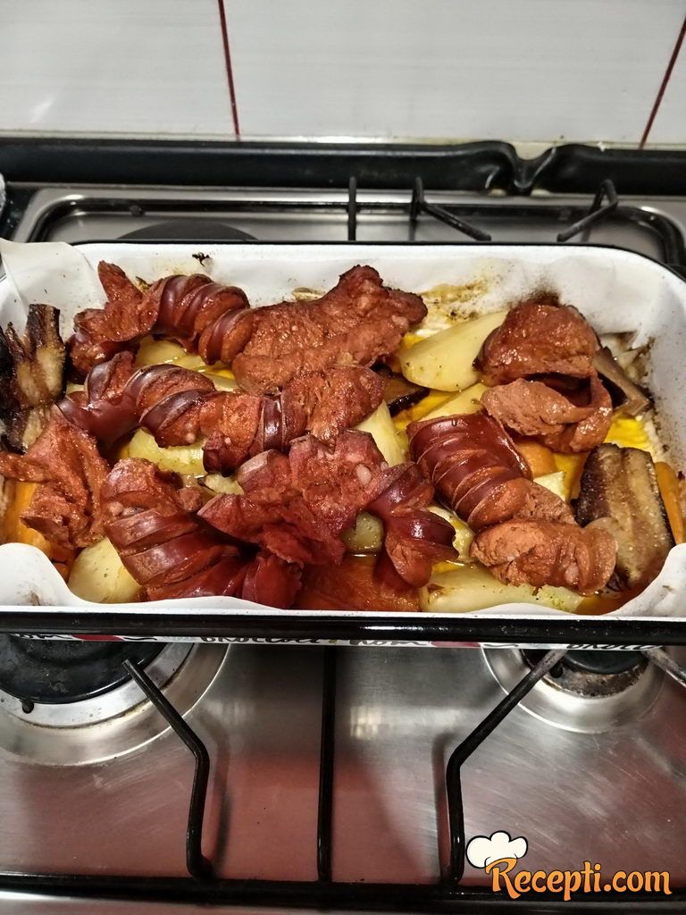 U đuveč pleh stavite papir za pečenje pa preko njega razmažite mast. Kobasice zasecite na režnjeve širine oko 1,5-2 cm, pa ih poređajte u pleh. Krompir oljuštite i isecite na kriške, pa ga začinite po ukusu i poređajte oko kobasica. Šargarepe isecite na duguljastu parčad, pa je dodajte u pleh, a zatim dodajte i slaninu.