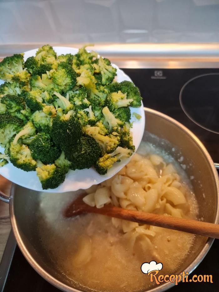 Dodaje pirinač, dolijte vode i dodajte cvetove brokolija. Začinite i kuvajte dok se pirinač i brokoli ne skuvaju.