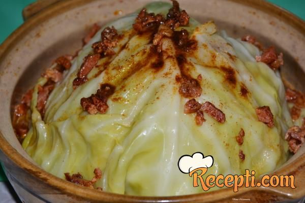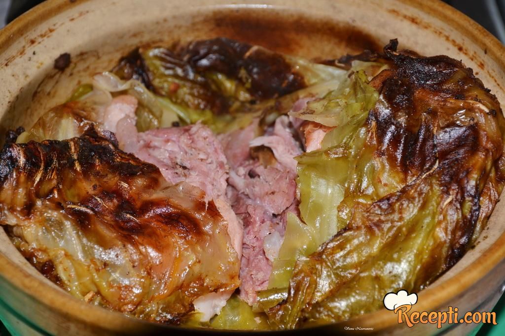 Na internetu sam naišla na recept Dimljena svinjska kolenica zamotana u kiseli kupus i pošto mi se jako sviđao recept dlučila sam da napravim. U dućanu nisam našla kolenicu nego barenu butkicu od 1,5 kg i odlučila sam da pošto je velika i dugačka oslobodim meso od kostiju i tako pripremam da mi stane u normalnu posudu i da ne dobijem preveliku količinu. Naišla sam na pakovanje kiselog kupusa u listovima, tako da sam jedan deo usitnila, a 5 najvećih listova sam koristila za uvijanje butkice (ostatak sam stavila u zamrzivač).