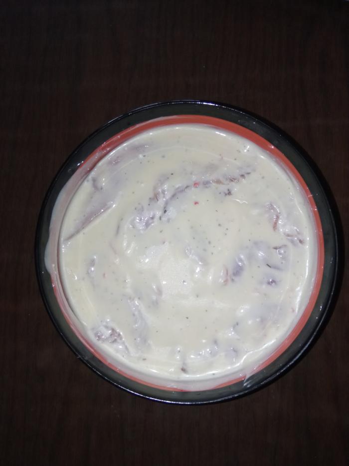 Piletinu iseći na šnite. Posoliti sa svih strana. U posudu umutiti jaje, dodati pavlaku, ulje, suvi biljni začin, senf i brašno sve lepo umutiti.