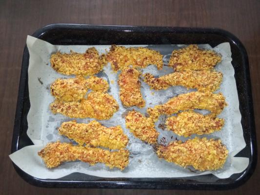 Kornifleks izmrviti, ne previše sitno, da ostanu malo krupniji komadići. Šnite piletine, vaditi iz pripremljenog poha, i uvaljati sa svih strana u kornifleks.
