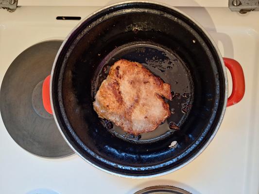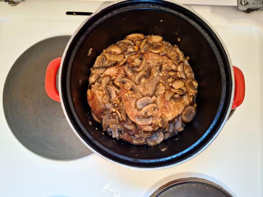 Dodati suvi biljni začin, beber, so i dinstati dok ne ispari višak vode koje su pečurke pustile. Naliti 100 ml vode, dodati svinjske šnicle i kikiriki.
