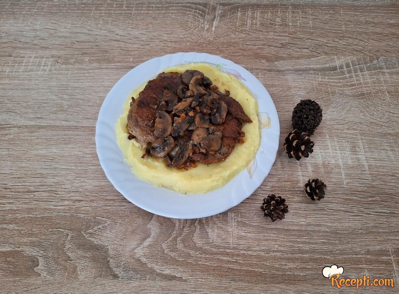 Na istom ulju propržiti seckani crni i beli luk, pa dodati šampinjone isečene na listiće.