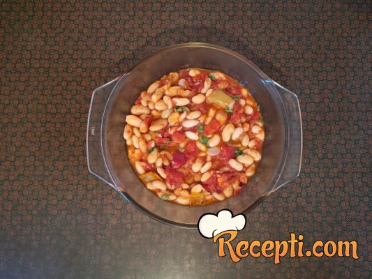 Sve promešati i naliti vodom u kojoj se pasulj kuvao tako da jedva pokrije pasulj. Pasulj začiniti i ostaviti da se krčka da se sjedine sastojci.