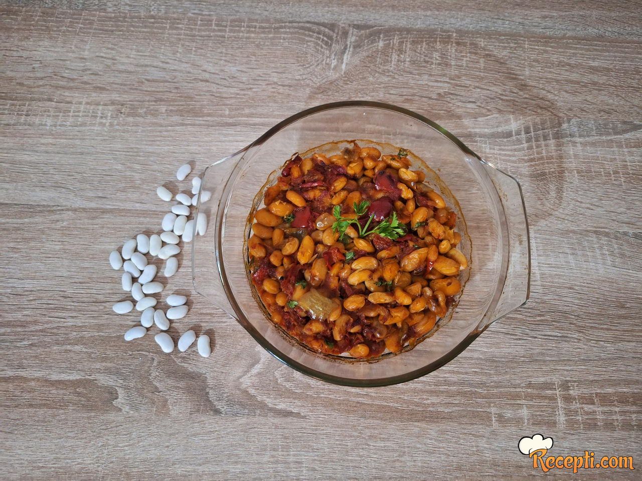 Pasulj sipati u vatrostalnu činiju ili tepsiju, pa preko posuti seckani peršun. Pasulj zapeći u rerni na 200 stepeni oko 15 minuta. Gotov pasulj služiti sa salatom po želji.