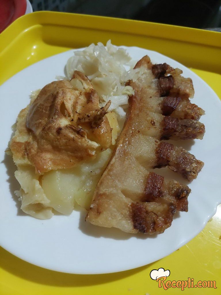 Krompir oljuštiti i poslagati u vatrostalnu činiju. Malo posoliti. Slaninu seći na tanko i zaseckati potom složiti preko krompira. Peći u rerni na 200 stepeni toliko da slanina lepo porumeni. Slaninu izvaditi na tanjir.