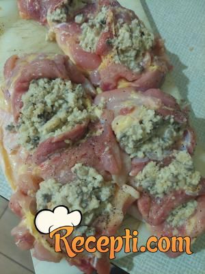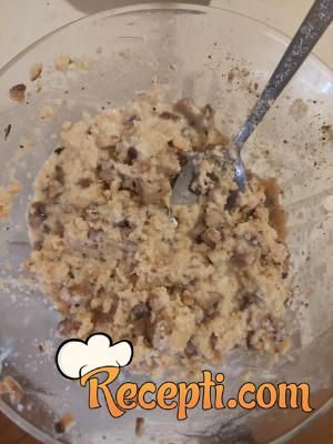 Hleb seći na kockice i preliti mlekom. Kada malo omekani dodaje se u šampinjone. Dodaje se i krem sir i jaje. Začiniti biberom, belim lukom, suvim biljnim začinom, bosiljkom i solju. Dobro se pomeša. Ako smesa zahteva dodati i prezle.