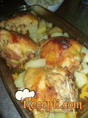 Peći meso na 200 stepeni oko sat i po. Pred kraj u vatrostalnu činiju ubaciti skuvani krompir. Zapeći još desetak minuta, ali bez folije.