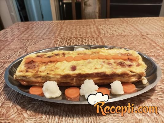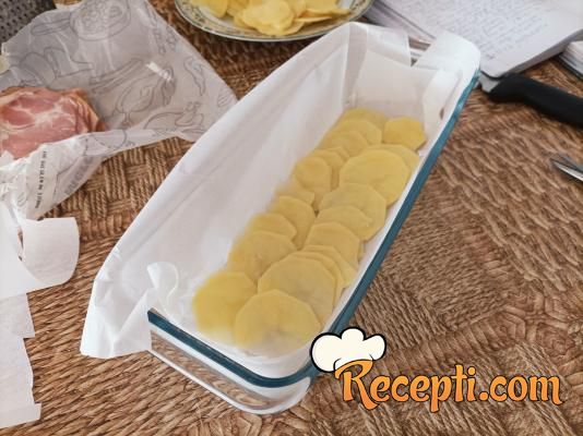 Preko krompira poređati tri tanka šnita dimljenog svinjskog vrata, pa preliti sa, oko, četiri kašike preliva sa sirom. Ponoviti postupak još tri puta, sve na isti način slaganja i prelivanjem kao i prvi put.