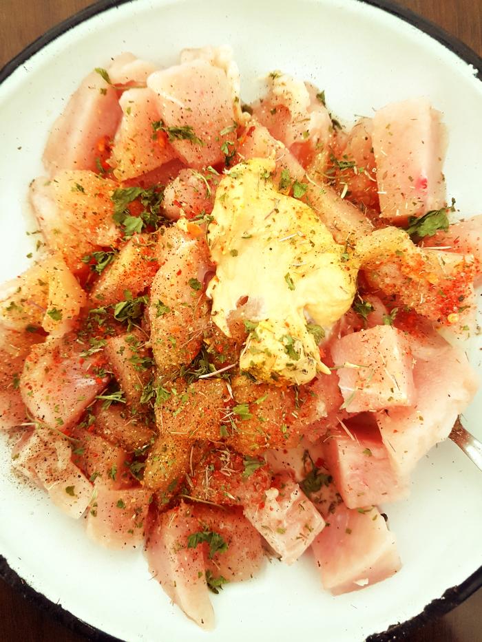 Pileće grudi isecite na kockice, posolite, pobiberite i začinite suvim biljnim začinom. Dodajte senf, seckan peršun i majčinu dušicu, sve dobro izmešajte pa dodajte kiselu pavlaku i brašno i ponovo sve dobro izmešajte pa ostavite da stoji oko 15 minuta.