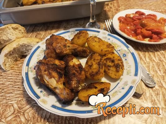 Izvaditi marinirano meso iz frižidera. Rernu uključiti da se zagreje na 200 stepeni. Krompir oljuštiti i iseći na polovine (ako su manji) ili na četvrtine (ako su veći). Odgovarajući pleh sa nelepljivim dnom (ili pleh prekriti pek papirom) samo malo premazati uljem. Poređati meso u pleh. Krompir ubaciti u posudu sa ostatkom marinade, dobro ih uvaljati u marinadu i poređati u pleh sa mesom. Krilca, batačiće i krompir samo malo poprskati sa uljem i staviti da se peku 45 minuta. Ako je potrebno, preokrenuti meso i vratiti da se zapeče (ja ga nisam preokretala, sve zavisi od šporeta). Poslužiti sa salatom po želji.