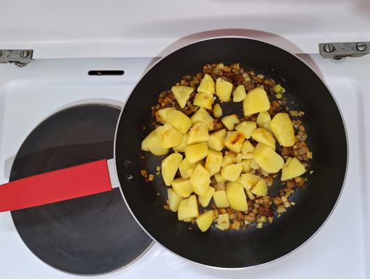 Kada mi je baba poslala domaće suvo meso odmah sam se setila kako mi je uz suvo meso često pravila restovan krompir. Volim restovan krompir sa crnim lukom i prazilukom. Često ga pravim i bez praziluka. Količinu crnog luka i praziluka možete da prilagođavate po svom ukusu. Krompir je preukusan i ovaj recept se lako i brzo pravi.