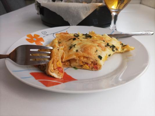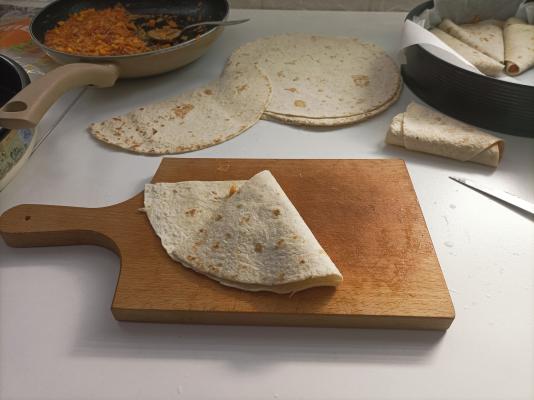 Tako formiranu punjenu tortilju prebaciti u posudu za pečenje sa vrhom koji je okrenut ka sredini posude. Na isti način formirajte i ostale trouglove od tortilja. Imaćete devet trouglova. Zadnju polovinu tortilje nafilujte, urolajte, savijte u oblik puža i popunite sredinu posude.
