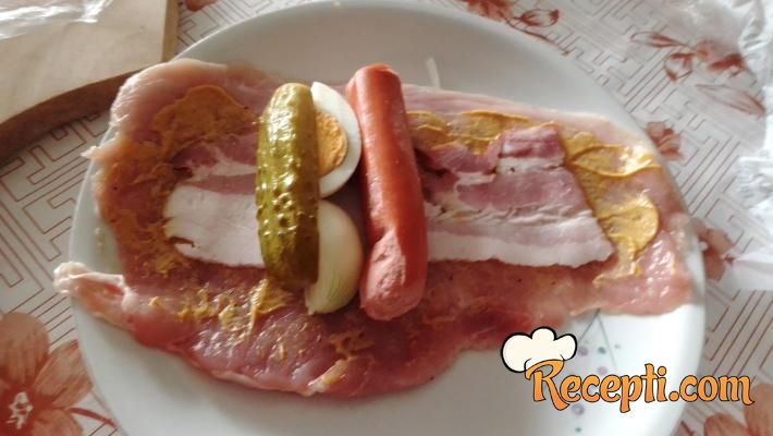 Šnicle izlupati posoliti pobiberiti i namazati senfom. Na svaku staviti po pola kobasice četvrtinu luka četvrtinu jaja i krastavčić. Uviti u rolat i pričvrstiti čačkslicom.