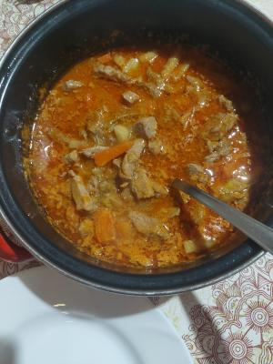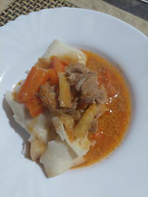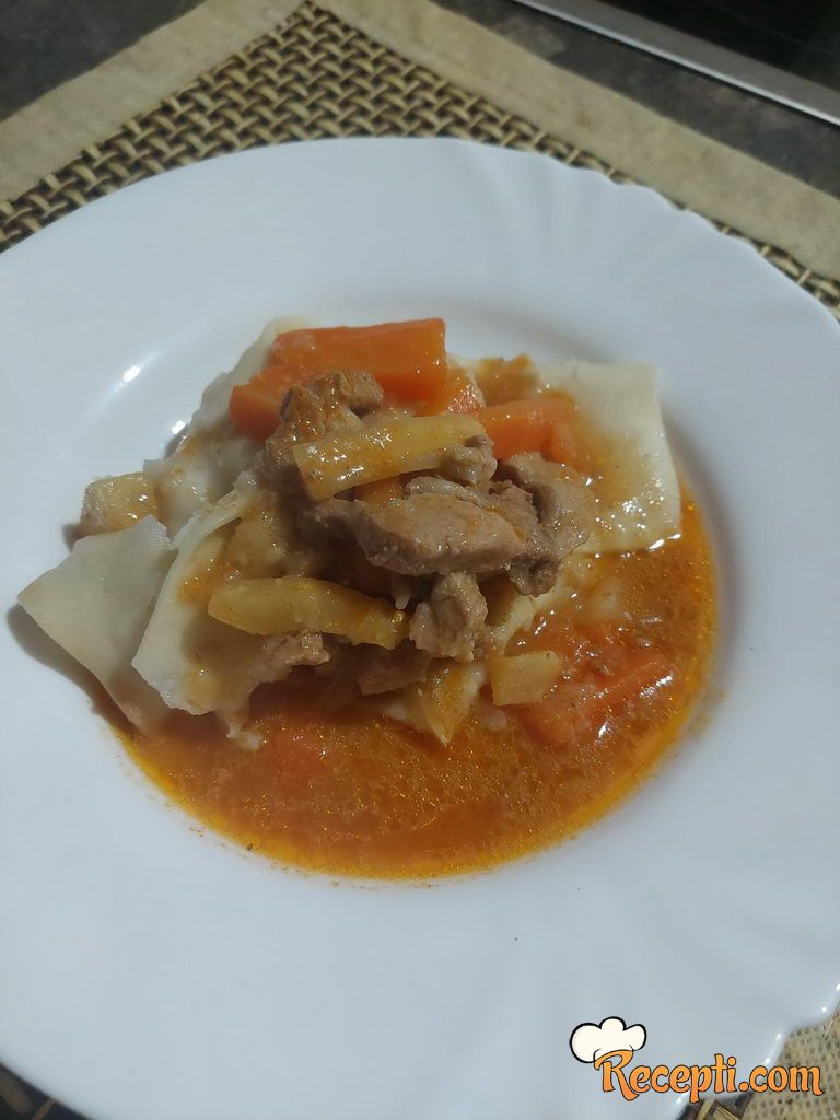 Luk seći sitno i prodinstati na masti. Dodati svjnjetinu sečenu na prutiće. Dinstati sa lukom. Za to vreme seći šargarepu i celera na istu veličinu kao i meso. Dodati povrće u jelo. Naliti vodom.