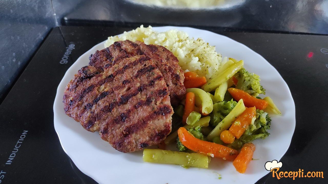Sredinu hleba preliti sa malo mleka i ostaviti nekoliko minuta da stoji, pa je dobro ocediti od mleka. U meso dodati sve navedene sastojke i oceđenu sredinu hleba i sve dobro sjediniti. Kašikom uzimati smesu i stavljati je između dva lista prijanjajuće folije ili pek papira, blago pritisnuti i oblikovati pljeskavice. Peći ih na zagrejanom gril tiganju sa malo ulja ili običnom tiganju.