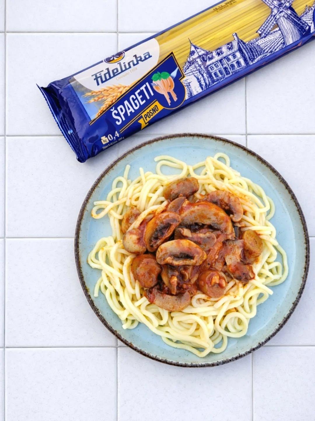 Na zagrejanom ulju propržiti sitno seckan crni luk dok ne omekša. Dodati šampinjone sečene na krupnije komade i dinstati dok ne puste svoju vodu i lepo omekšaju. Zatim dodati oljušteni paradajz i mlevenu crvenu papriku, posoliti, pobiberiti i začiniti po ukusu. Kuvati još oko 10 minuta uz povremeno mešanje, dok se sos ne sjedini. Služiti uz kuvane posne špagete.