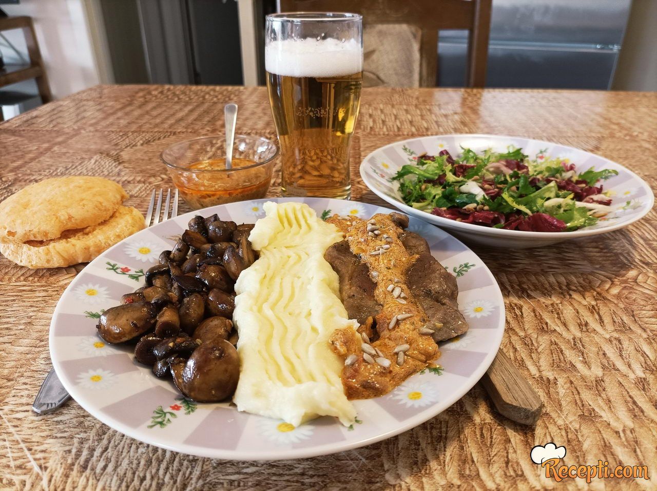 Sos: Na masnoći od prženja mesa prodinstati sitno iseckani beli luk, dodati senf, ajvar, vodu i sve dobro promešati. Pobiberiti i posoliti po ukusu (pažljivo sa dodavanjem soli, ako koristite kajmak, možda vam neće so ni trebati). Krčkati dok sos ne počne blago da se zgušnjava, tada dodati kašiku kajmaka/milerama i mešati dok se kajmak ne otopi.