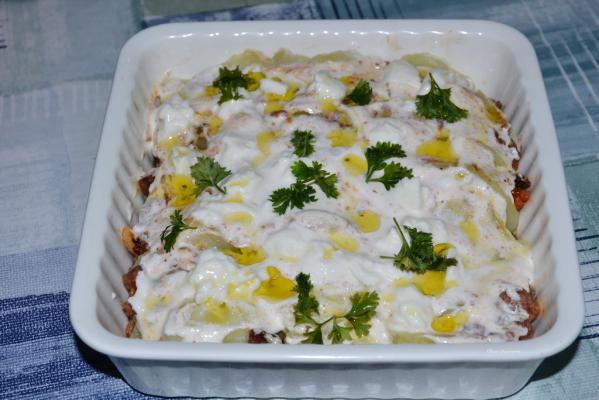 U vatrostalni sud 15 cm x 15 cm staviti malo maslinovog ulja te ređati malo ukoso krompir, mleveno meso pa opet krompir i tako redom dok se ne utroši sav materijal.