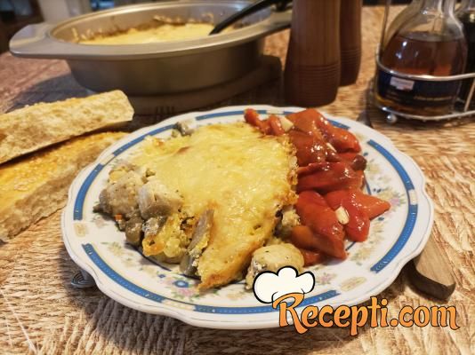 Odgovarajuću posudu sa nelepljivim dnom (koristila sam dublju posudu veličine 24 cm) samo malo premazati uljem i izručiti proprženo meso. Ravnomerno ga rasporedite. Posuti ga iseckanim peršunom, solju i biberom po ukusu. Preko mesa rasporediti pržene šampinjone. U isprženu šargarepu i crni luk dodati kiselu pavlako, promešati da se sve sjedini i premazati preko pečuraka. Preko obilno narendati kačkavalj i staviti u ,prethodno zagrejanu, rernu na 200 stepeni da se peče sve dok kačkavalj ne porumeni, oko 25-30 minuta. Poslužiti sa salatom po želji.