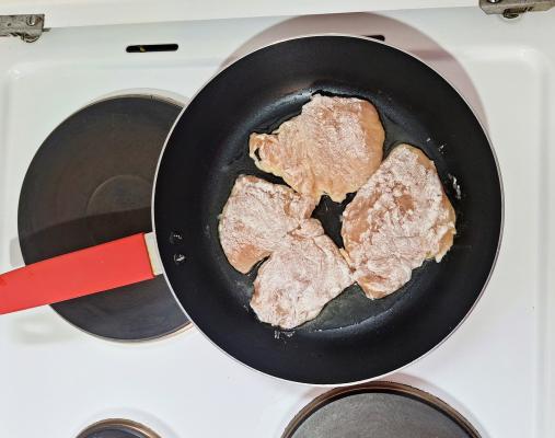 Šnicle posoliti i pobiberiti, izlupati tučkom za meso i uvaljati ih u brašno.