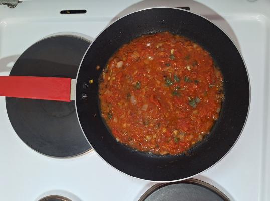 Sipati paradajz pelet, sok, šećer pa kuvati oko 15 minuta uz dolivanje vode po potrebi.