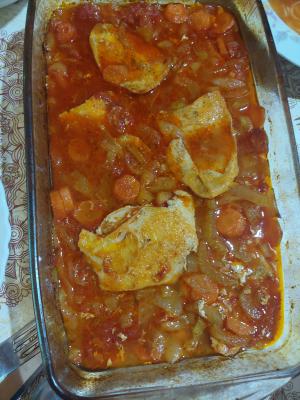 Piletinu seci tanko. Posloliti i biberiti. Poslagati u namascenu vatrostalnu ciniju. Luk naseci na listice, sargarepu pa kolutove, papriku i paradajz seci na kockice i saseckati celer stap. Svo povrce staviti preko belog mesa. Preliti sa malo vode i prekriti folijom. Peci u rerni na 200 stepeni.