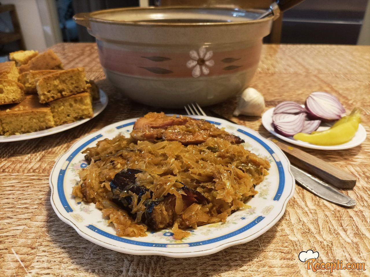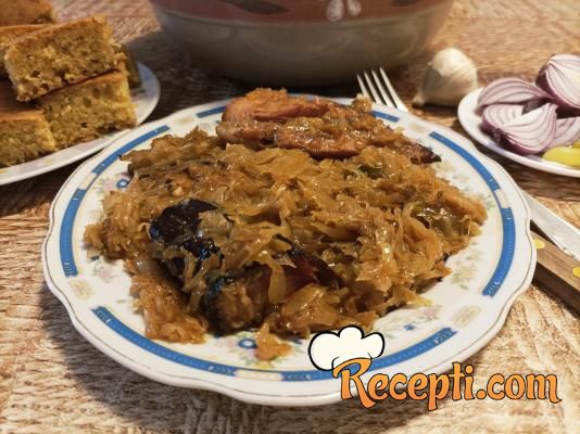 Kupus ribanac, ako je slan, isprati ga u nekoliko voda i dobro ocediti. U zemljanu posudu (koja se dobro premaže mašću) ređati naizmenično - na dno staviti deo kupusa, preko ide deo luka sa začinima, pa poređati suvo meso - opet ide kupus, luk, meso i na kraju prekriti sa kupusom. Sipati 150 ml tople vode (vodu sipajte u posudu gde se dinstao luk, da "spere" sve ostatke začina, pa je sipajte u kupus), ubaciti listiće lovora, poklopiti i staviti u hladnu rernu. Rernu uključiti na 200 stepeni i posle 40-50 minuta (od momenta kada se rerna zagrejala) smanjiti temperaturu na 160 stepeni i pecite još dva sata.