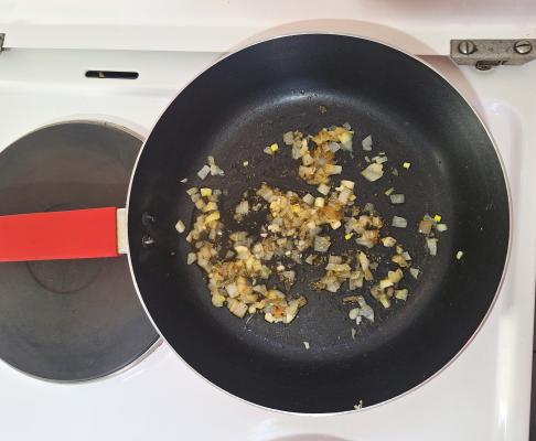 Na zagrejanom ulju u tiganju, propržiti crni luk. Povremeno mešati, pa kada luk postane staklast, dodati nekoliko kašika vode i promešati. Uz stalno mešanje da ne zagori, doliti malo vode i dinstajti još 2 minuta. Onda dodati sitno seckan beli luk, majčinu dušicu, origano, so i biber, pa ostaviti da se krčka jedan minut.
