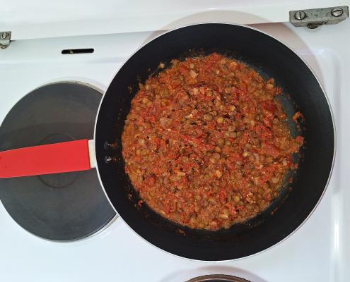 Dodati sočivo i mlevene orahe, pa mešati dok sos ne proključa. Smanjiti temperaturu pa krčkati uz mešanje još 20 minuta.