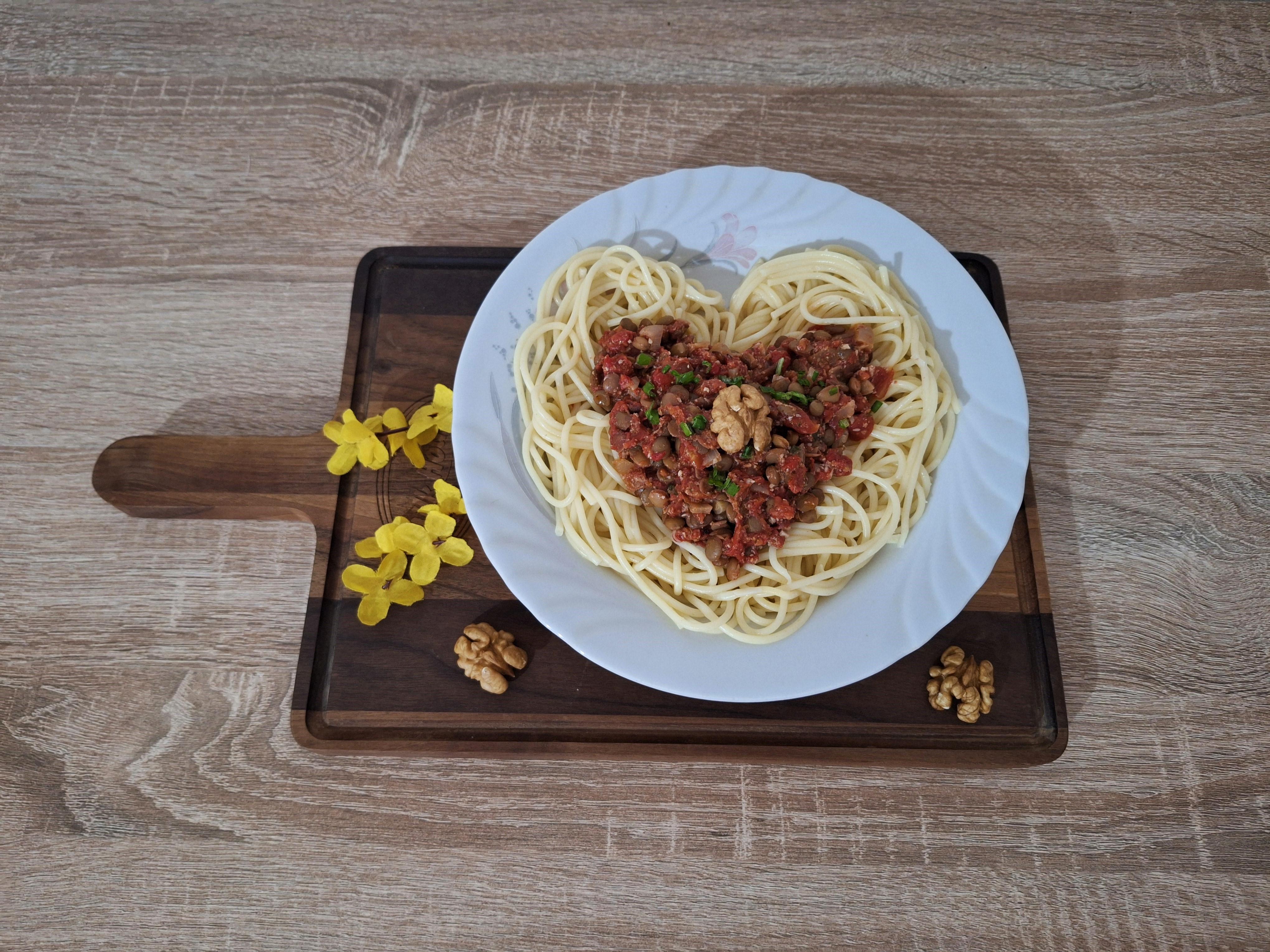 Možete po ukusu odabrati drugu testeninu. Crno vino nije obavezan sastojak u sosu. Ovo je jako lep sos za sve ljubitelje sočiva.