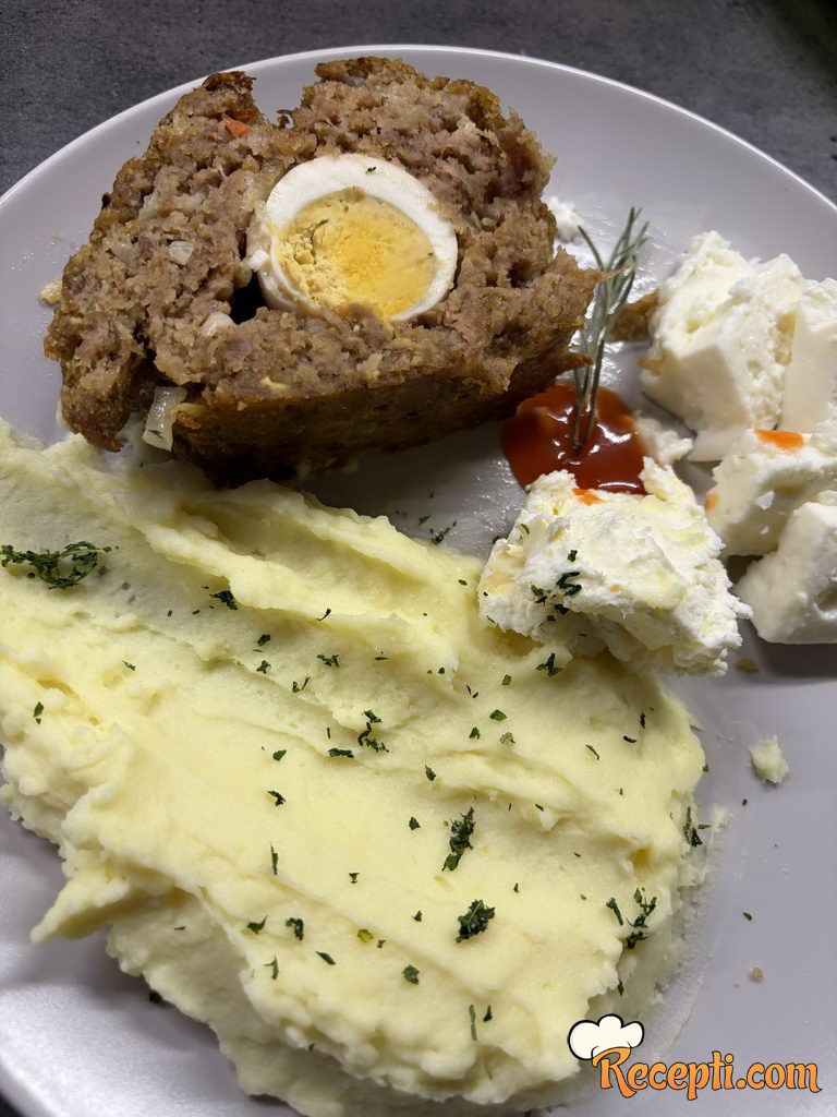 Luk narendati ili iseckati sitno pa dodati mesu, dodati dva jajeta, prezle i zacine, pa sve rukom umesiti. Razvući na pek papir pa na jedan kraj poređati kuvana jaja, urolati sa papirom i staviti 10-ak minuta u frizider. Za to vreme upaliti rernu na 200 C da se greje. Ubaciti meso u rernu i peći nekih 30-ak minuta. Kada je gotovo sačekati da se prohladi, pa seći na parčiće željene debljine.