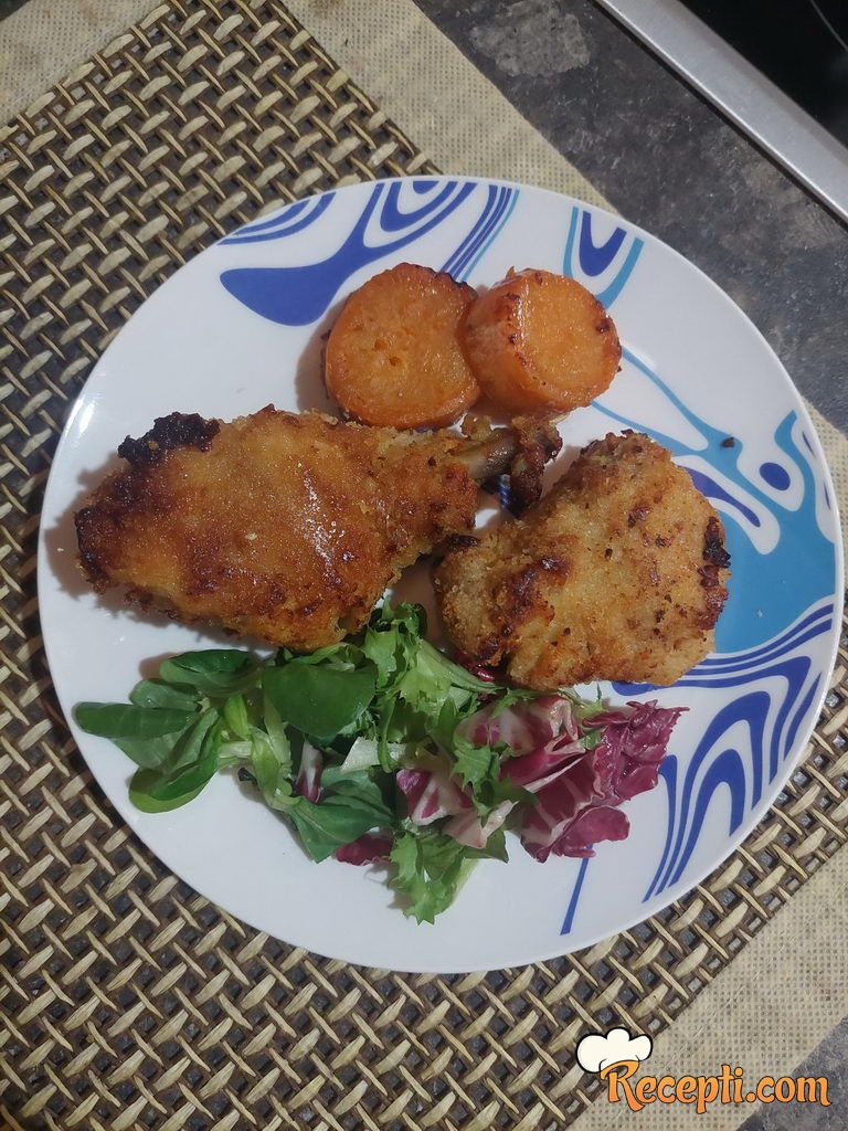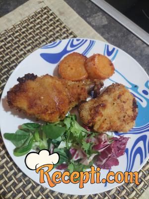 Piletinu raseći na komade. Posoliti. Pohovanje je redovno, prvo brašno, jaja i prezla. Složiti spremljeno meso u namašćenu vatrostalnu ili pleh. Na svaki komad mesa staviti po kašičicu masti.