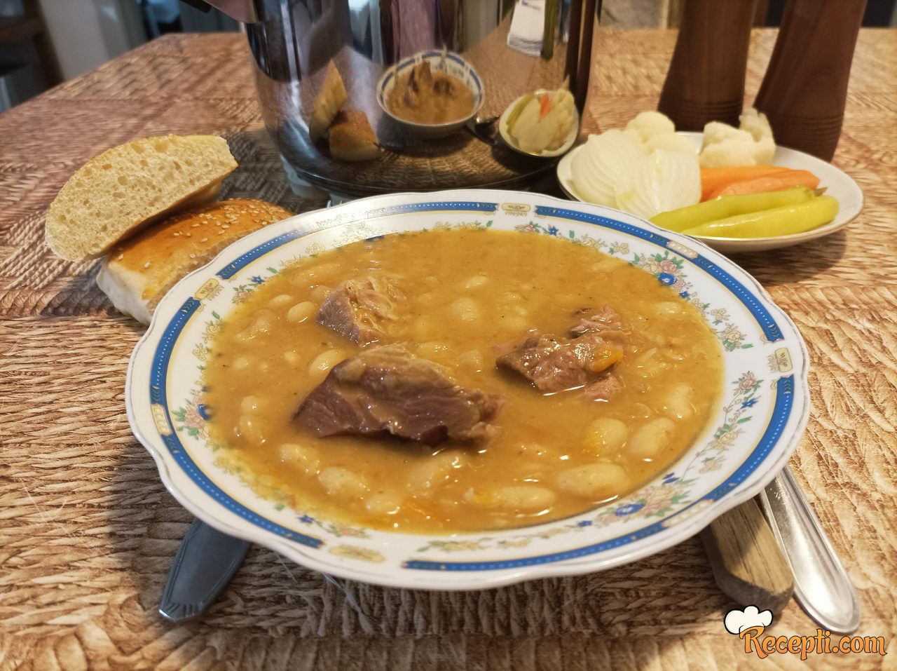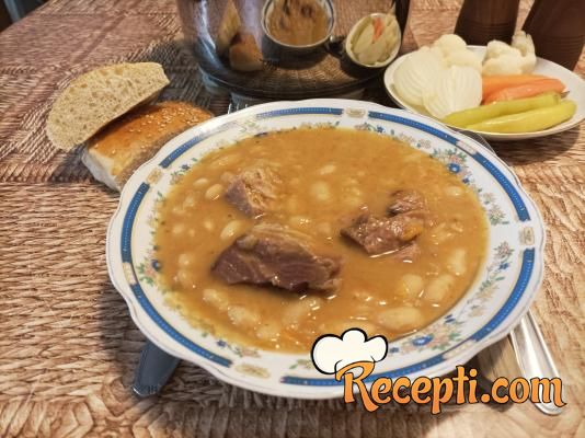 Pasulj staviti u dublju posudu, naliti hladnom vodom i ostaviti da odstoji u vodi preko noći. Narednog dana procediti pasulj, naliti ga sa novom vodom i staviti da provri. Kada pasulj provri, ponovo ga procediti, isprati pod mlazom tople vode i sada je spreman za dalje kuvanje. Crni luk, šargarepu i koren celera staviti u secko i sitno iseckati. Čen belog luka oljuštiti i samo preseći na pola.